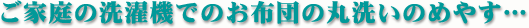中わた量が、1.8kg以上の商品はご家庭の洗濯機での丸洗いは、お奨めいたしません。お風呂洗いの場合でも、すすぎは充分行って下さい。洗剤の残留がある場合は、機能も悪くいなりますし、身体にも良くありませんので、ご了解下さい。