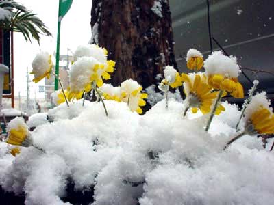 寒さの峠を越したものと勘違いした家内が、大庭園に花を植えたとたんに「雪」…